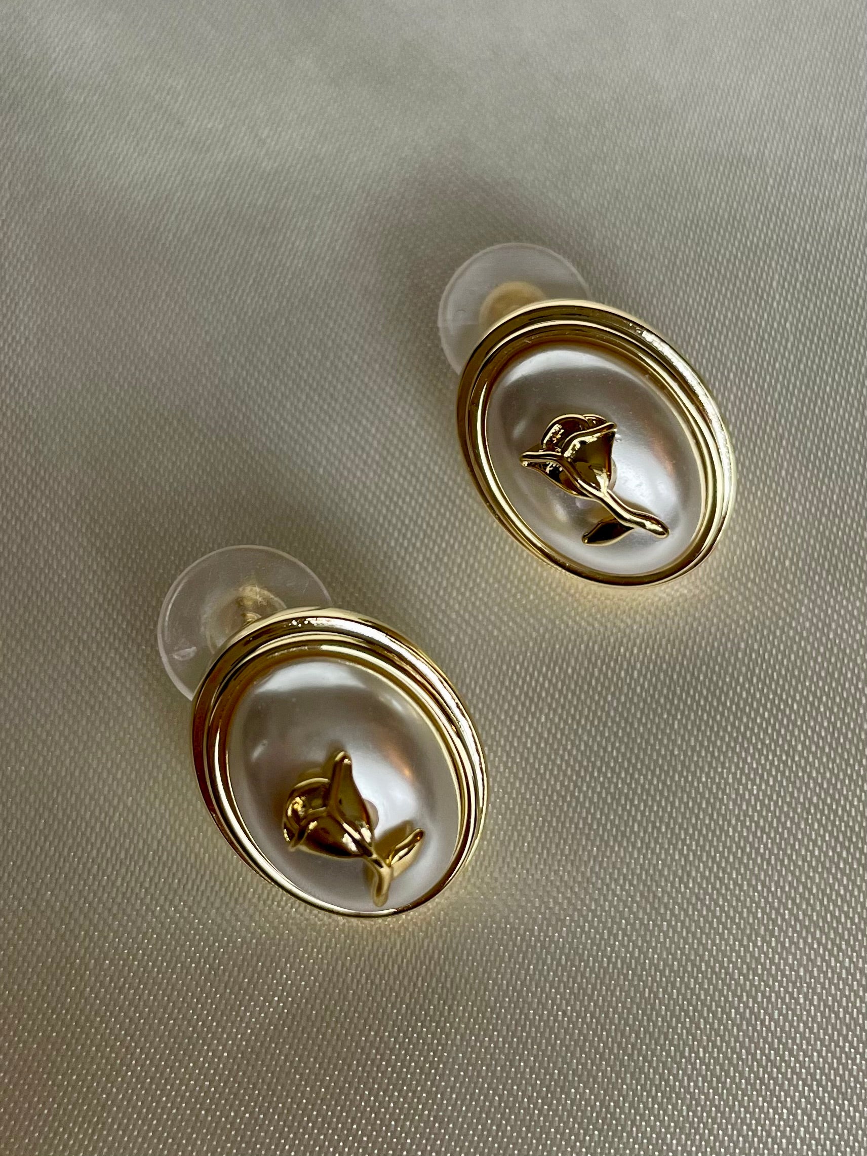 Boucle d’oreille, de couleur blanche / nacré avec le contour doré.